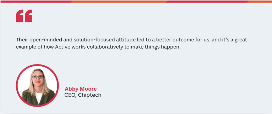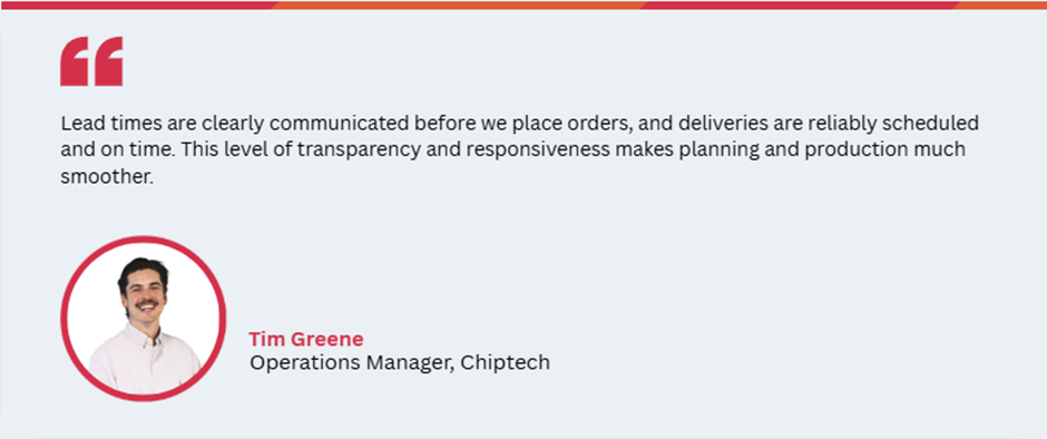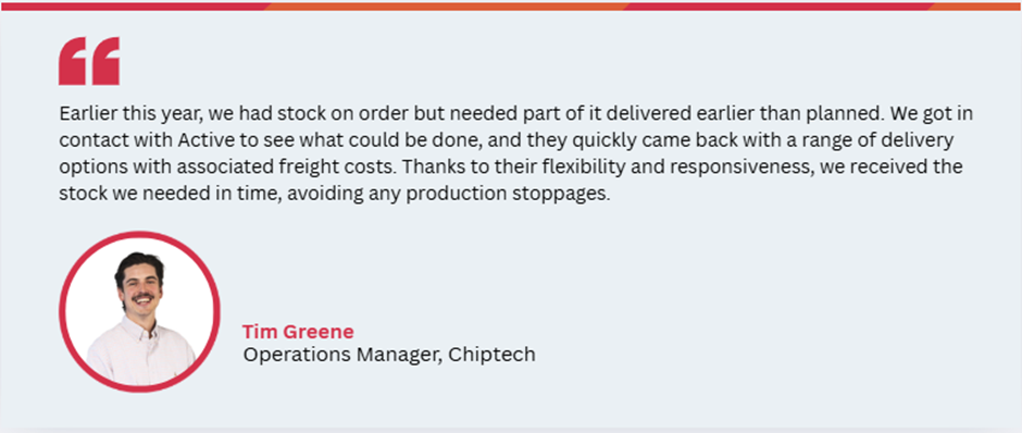 Active’s stock management service is built on clear communication, reliable scheduling, and proactive planning. By providing transparent lead times, maintaining flexible logistics, and holding local stock, Active helps Chiptech manage inventory risks and keep operations running efficiently.